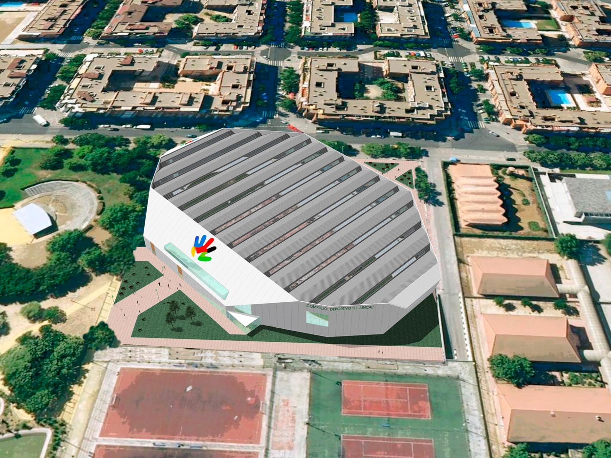 Propuesta de infografía del Complejo deportivo el Juncal en Torrejón de Ardoz. Vista Aérea principal.