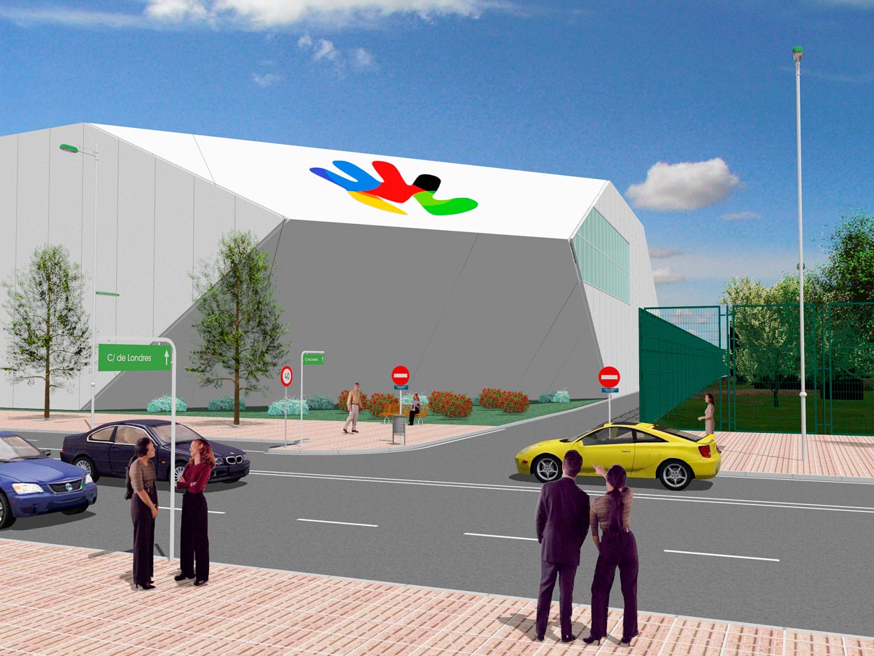 Propuesta de infografía del Complejo deportivo el Juncal en Torrejón de Ardoz. Vista acceso principal.