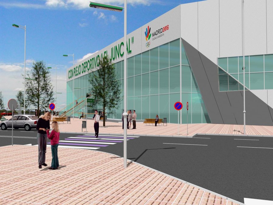 Propuesta de infografía del Complejo deportivo el Juncal en Torrejón de Ardoz. Vista desde calle Londres izquierda.