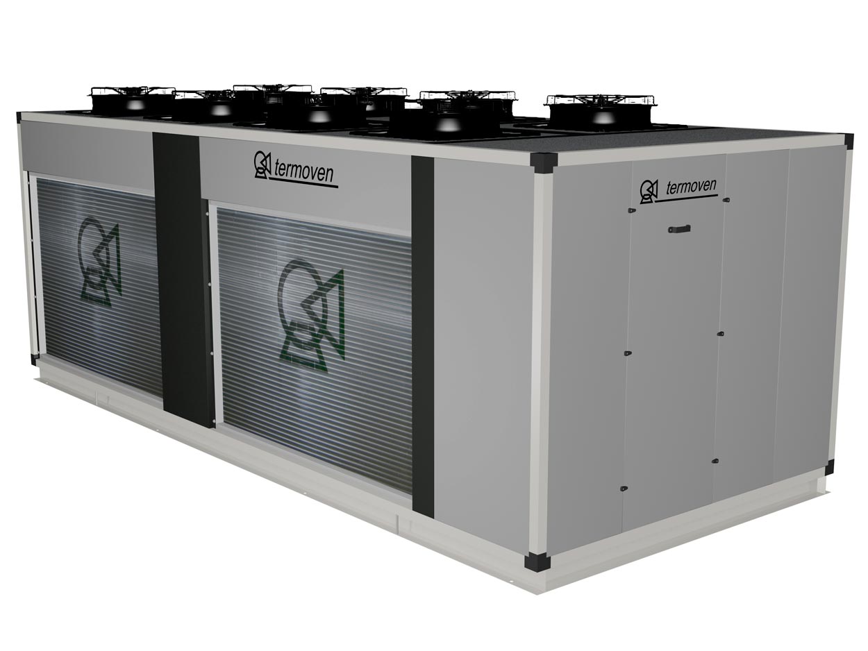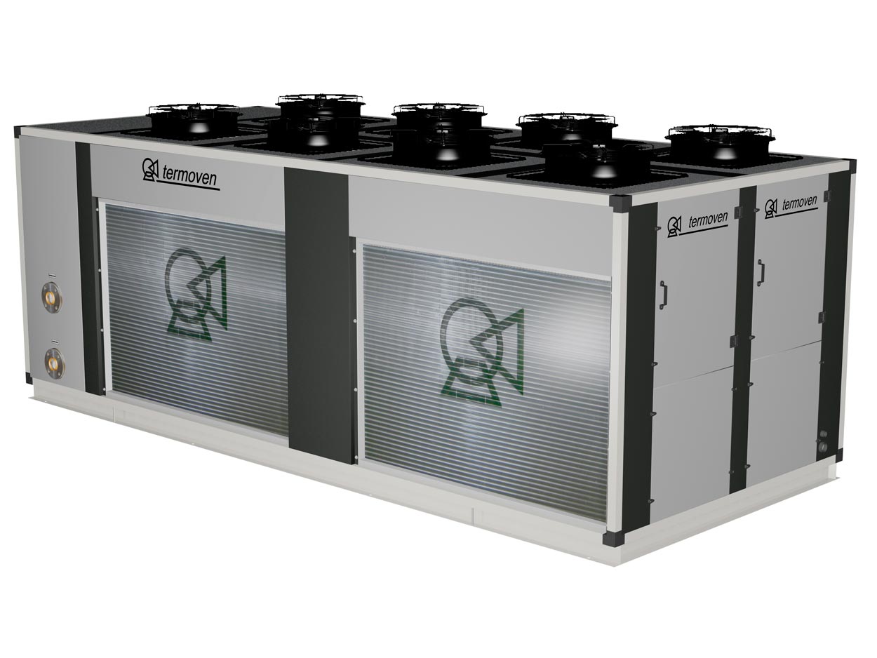 Infografía de enfriadora mod. ETX 230-4 DI. Vista exterior frontal derecha.
