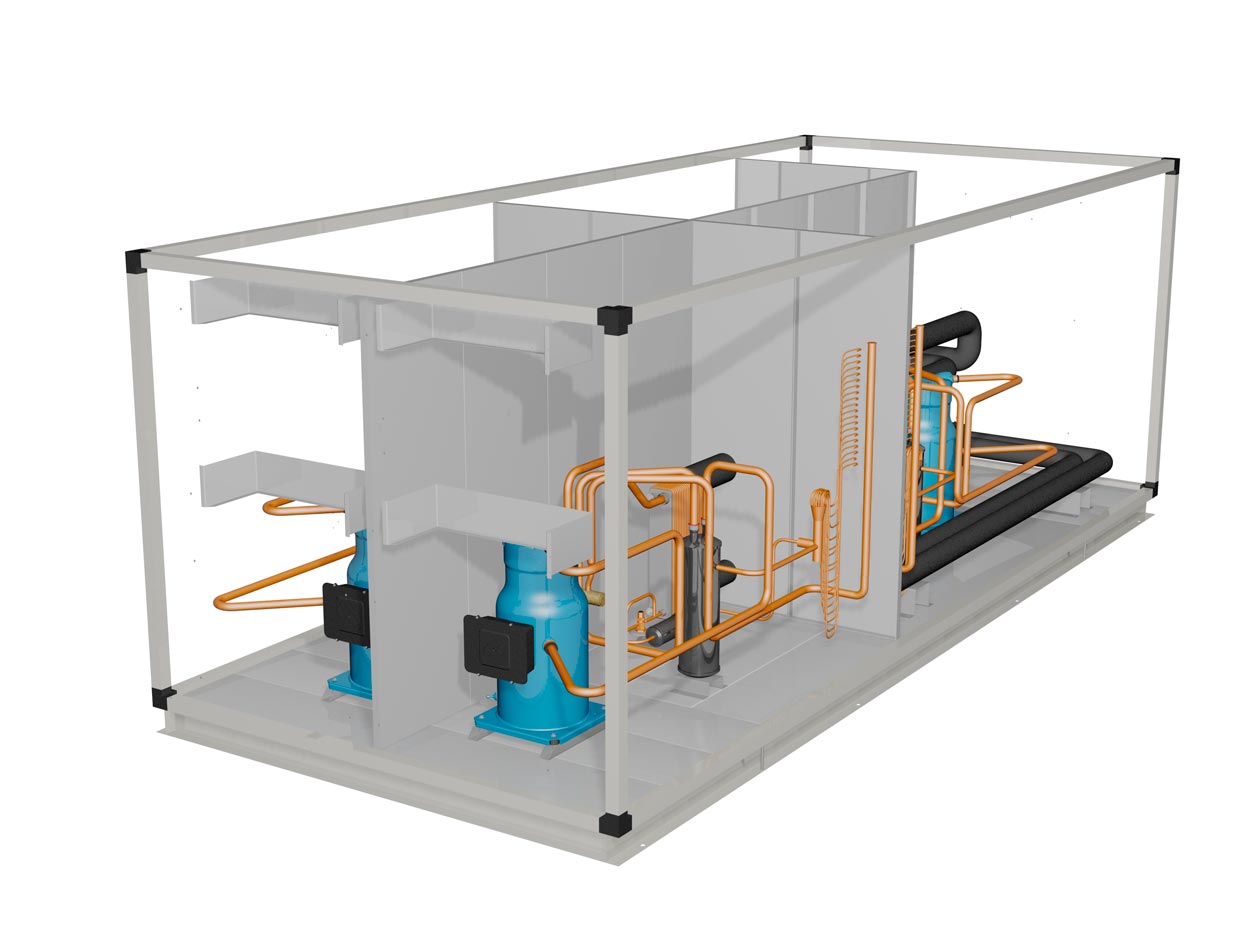 Infografía de enfriadora mod. ETX 230-4 DI. Vista interior frontal derecha.