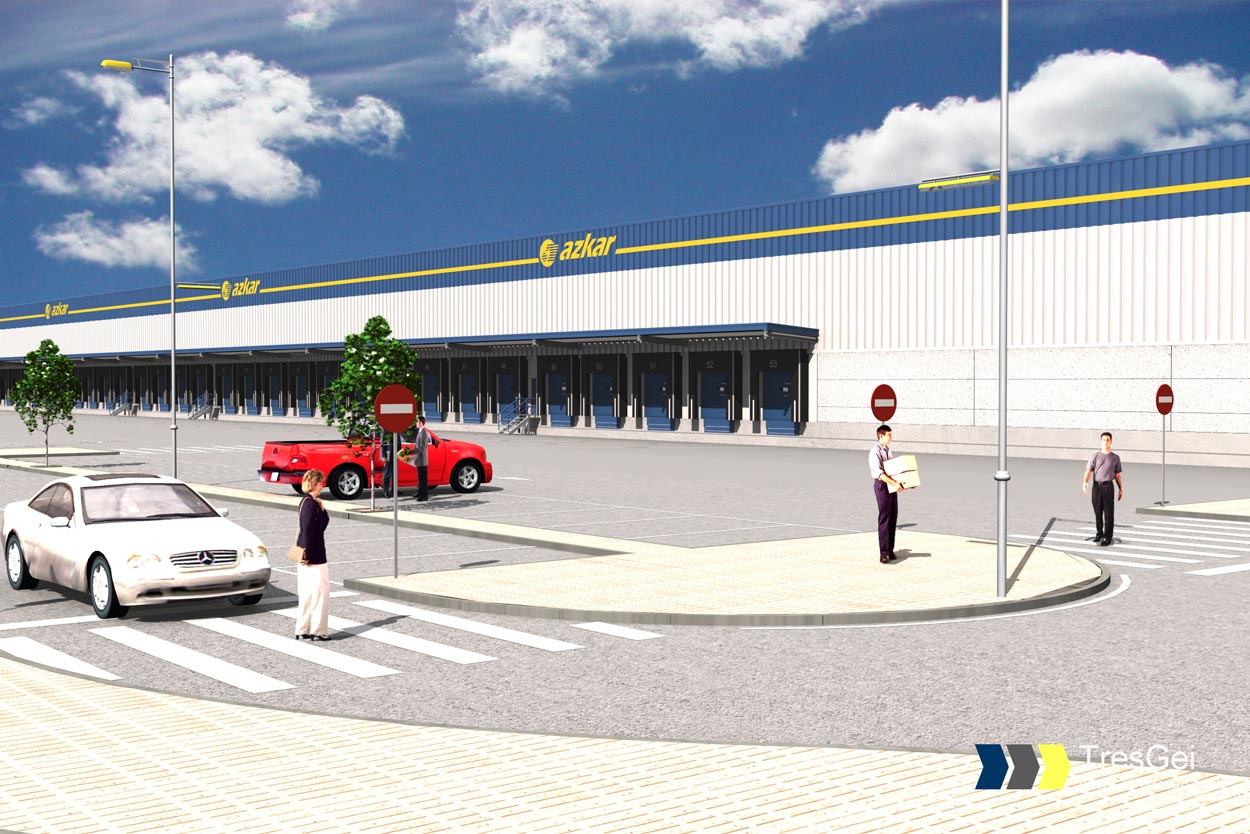 Infografía de nave industrial Azkar. Vista nave muelles