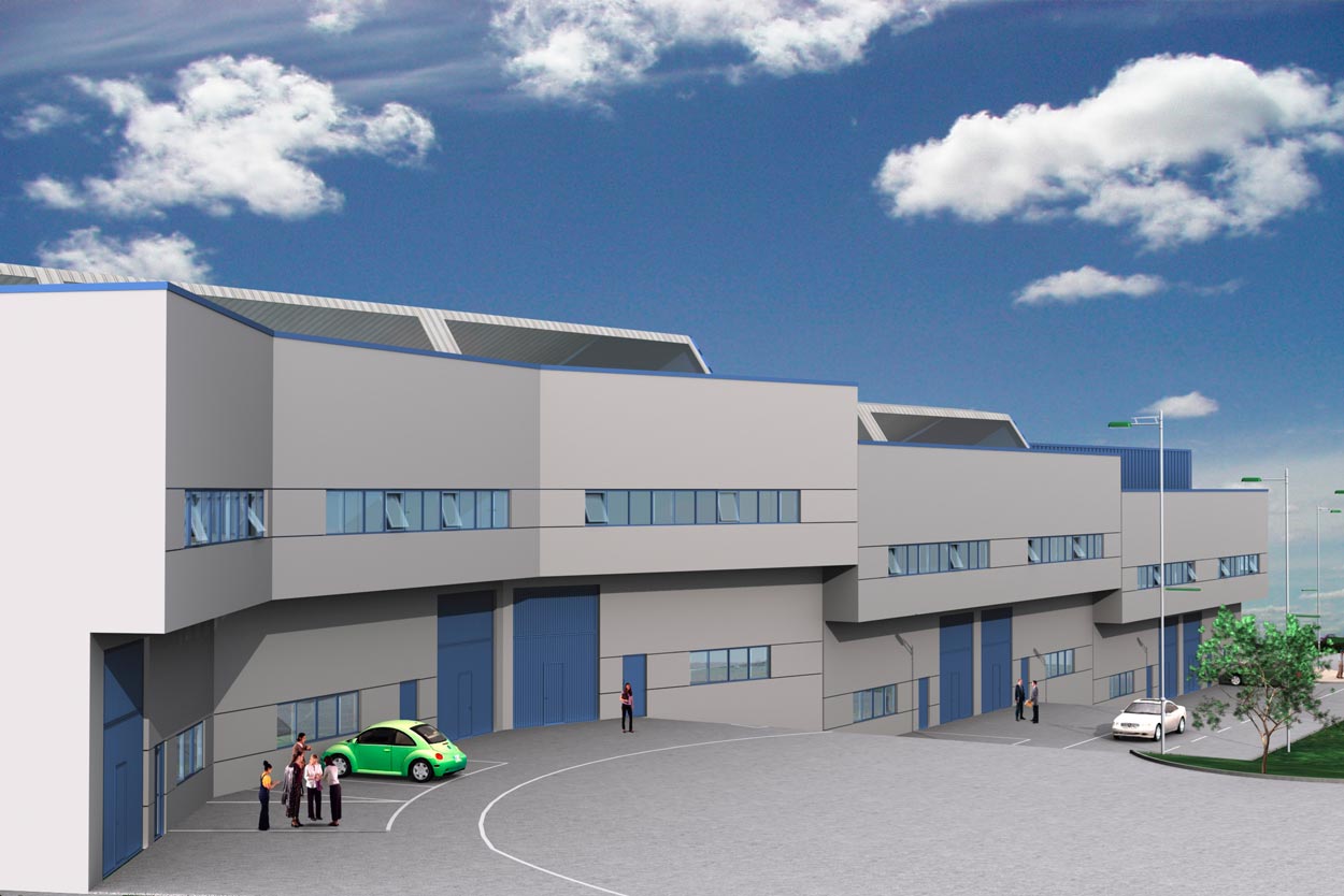 Infografía nave industrial Olano. Vista trasera acceso oficinas.
